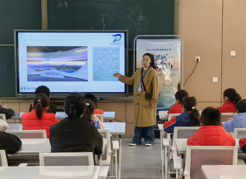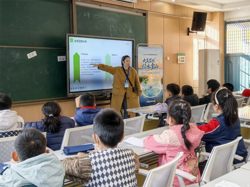 课堂上,侯卫茹以公园的科普宣教馆为主线,从湿地基础知识、类型分布、生态特征到保护利用与未来价值,层层深入讲解。