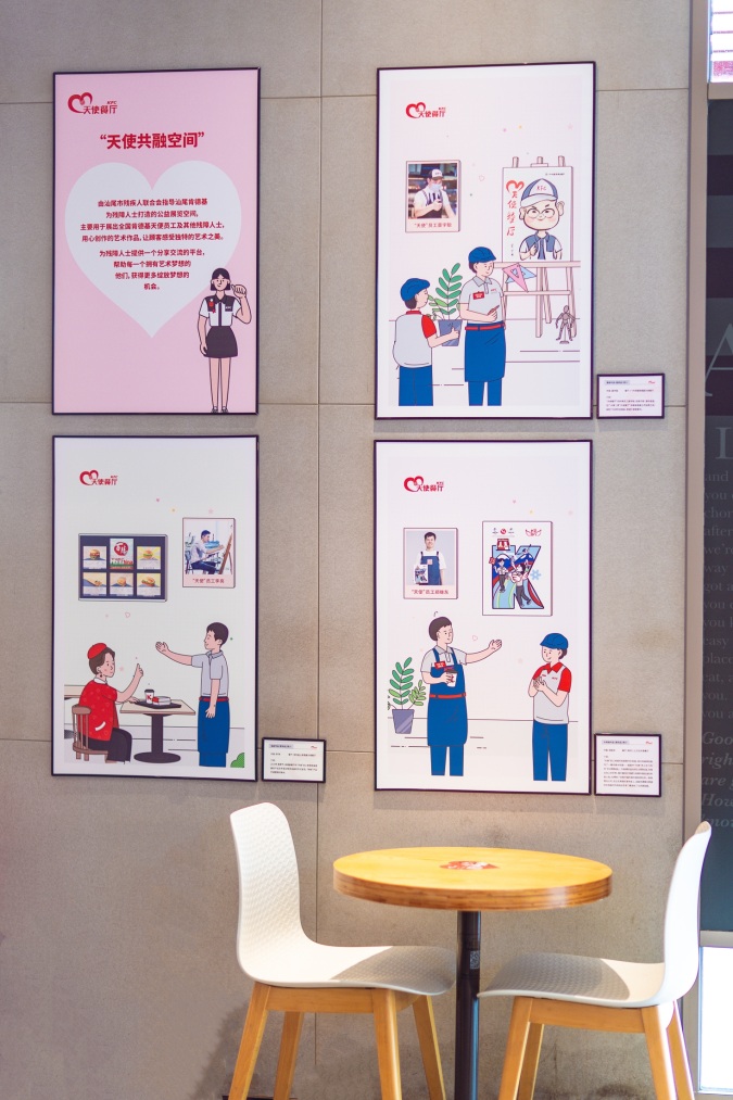 餐厅里特别的艺术作品展示墙,吸引了不少顾客关注。丰富的色彩搭配、富有想象力的艺术作品,这正是肯德基餐厅为“天使”们特别打造的“天使共融空间”,帮助拥有艺术梦想的残障人士获得更多展示自我的机会。