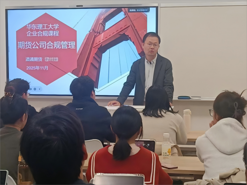 为深化校企协同育人,助力高校法治人才培养,同时宣传期货行业合规文化,11月21日,道通期货合规部负责人受邀前往华东理工大学法学院,为企业合规课程的同学们带来题为《期货公司合规管理》的专题授课。此次分享既是道通期货践行"校企协同、产教融合"理念的重要实践,也是道通期货与华东理工大学法学院携手推进金融法实务课程建设与专业融合的重要举措。