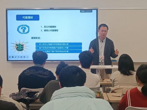 授课中,道通期货合规部负责人凭借丰富的期货行业合规管理经验,系统讲解了期货市场参与主体与监管体系,详细阐述了期货交易所、期货公司、投资者等市场主体的角色定位,以及证监会、期货交易所、期货业协会等监管架构;深入分析了期货公司常见违规情形,包括代客理财、强行平仓、员工交易等典型案例;全面介绍了期货公司合规工作的日常要点,相关内容为学生理解期货市场合规运营机制与法律风险防范提供了清晰的理论框架和实践视角;针对当前期货行业关注的热点问题,聚焦期货市场功能发挥与合规监管,引导学生从法律与合规视角思考期货市场发展与风险管理的平衡。授课内容紧密联系实际,案例丰富,逻辑清晰,特别是对期货市场违规案例的深入剖析,受到在场师生的一致好评。