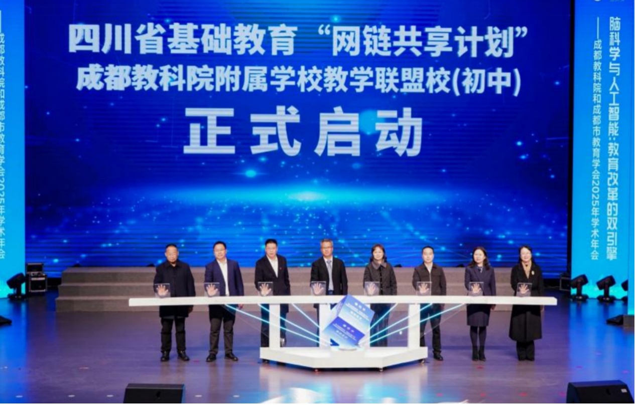 随后,会议举行四川省基础教育“网链共享计划”成都教科院附属学校教学联盟校(初中)启动仪式。该计划通过资源互联、课程共建、师资共育、数据共享打破校际壁垒,构建区域教育共同体,促进优质教育资源流动。