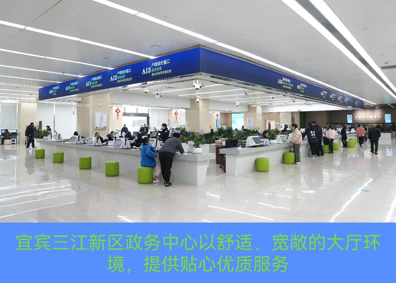 宜宾三江新区政务中心以舒适、宽敞的大厅环境,提供贴心优质服务
