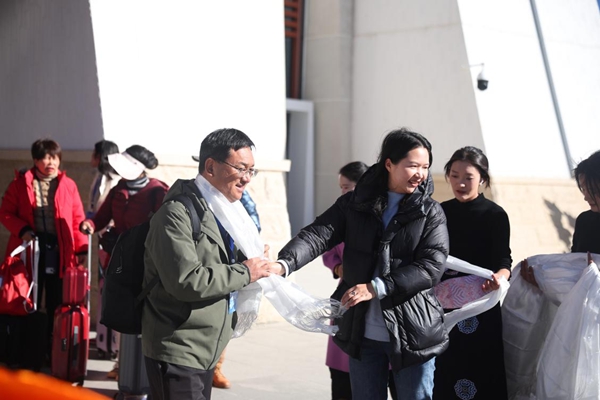 迪庆州文旅局相关领导率队到香格里拉高铁站,以高原最隆重的传统礼仪迎接远道而来的宾客。当列车缓缓驶入站台,迎接团队身着藏族民族服饰,以敬献洁白哈达、敬上醇香青稞酒的最高礼遇,热烈迎接远道而来的朋友。随着首批嘉宾步出车厢,工作人员迎上前去,将哈达轻轻披挂在每位宾客肩颈,并送上真挚的“扎西德勒”祝福。这一传承千年的藏族迎宾礼,不仅代表着雪域高原最诚挚的问候,更传递着迪庆对四海宾朋的热切期盼。