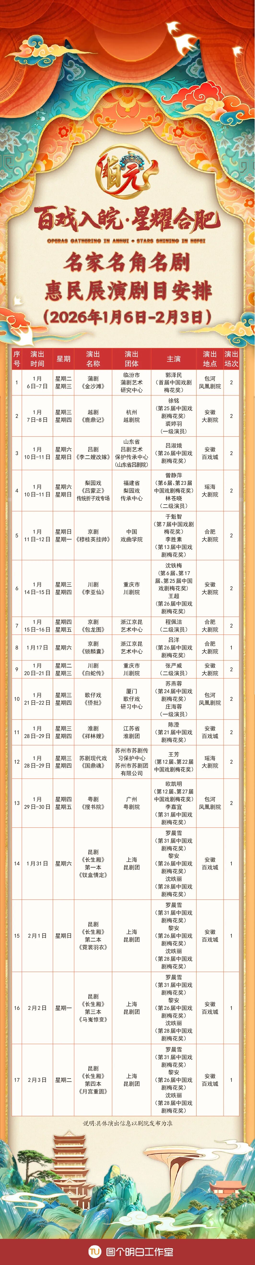 近日,“百戏入皖・星耀合肥”戏曲主题活动2026年1月名家名角名剧惠民展演排期正式公布。