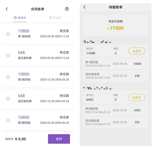 登录相寓APP →进入合同账单页面 →选择待缴账单