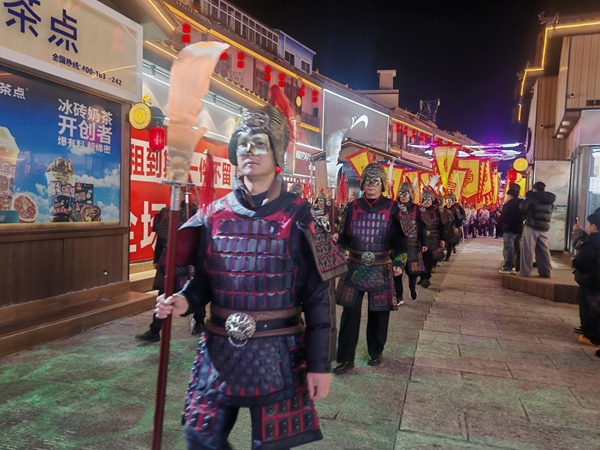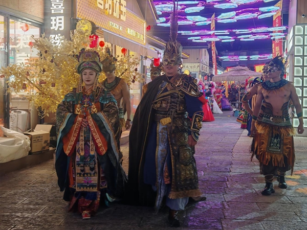 当天19时,由工作人员饰演的“句町王”与“王后”身着华服,率领文武百官、宫女侍卫、各少数民族代表方阵以及超模方阵从莲湖公园正门出发,沿着句町夜花街进行“时空穿越游街”。在这场穿越古今的巡游中,“句町傩”夜花街万人非遗化妆盛宴,生动再现了古句町国的宫廷仪仗与多民族融合的历史风貌,吸引了沿途大量居民和游客驻足观看,拍照留念,现场气氛热烈非凡。