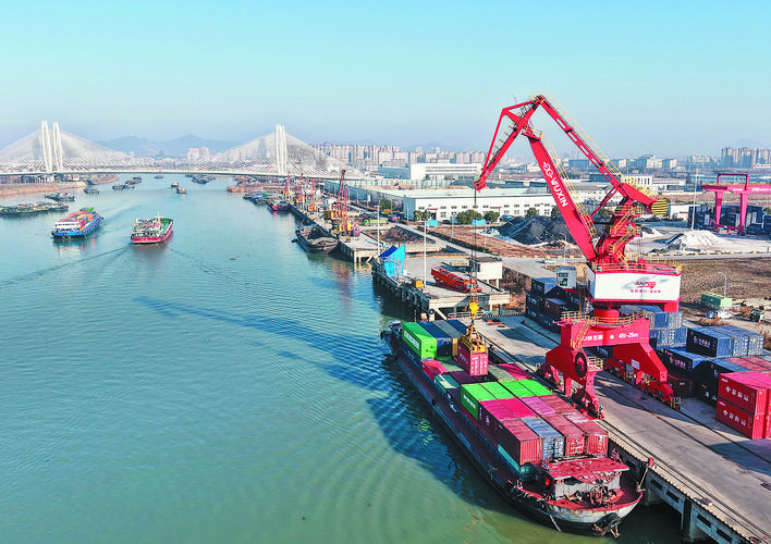 1月7日上午,巢湖港码头呈现一派繁忙有序的景象:集装箱整齐码放,门机高效装卸,船舶往来频繁,运输车辆顺畅流转。