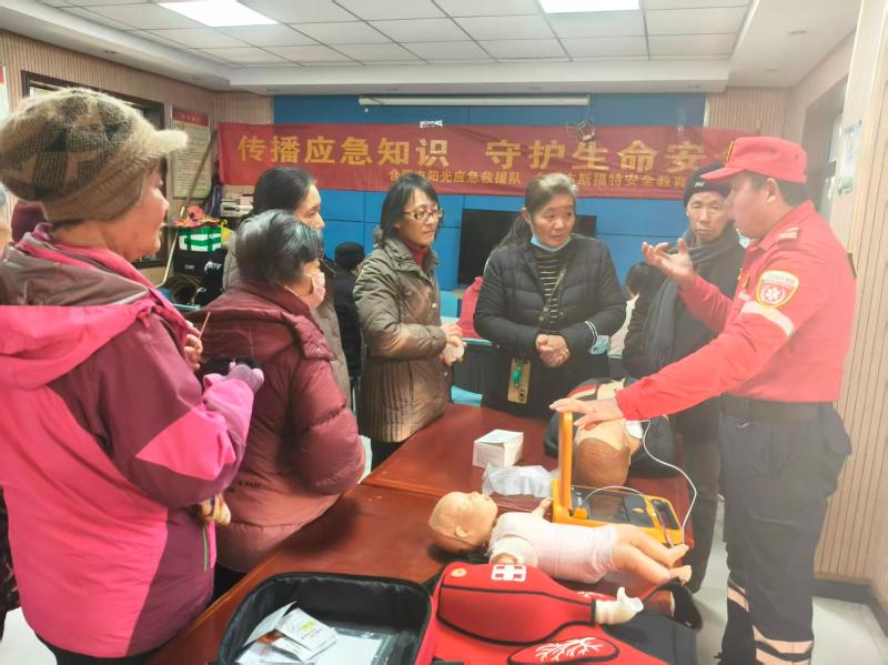 为提升社区居民应急防护能力。近日,庐阳经开区金池社区联合合肥市阳光应急救援队在社区老少活动家园开展应急知识宣讲活动。在活动现场,救援人员围绕心肺复苏(CPR)、海姆立克急救法、外伤止血包扎等常见急救技能向居民们耐心讲解并通过实操演示的方式,详细介绍了急救黄金时间的重要性、操作步骤及注意事项。此次宣讲将应急救援知识送到居民身边,有效增强了社区群众的应急救援意识。(文/谭炎哲 庐阳区人民政府)