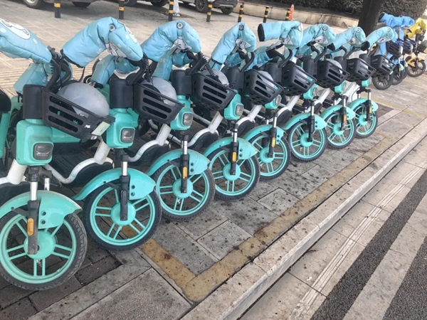 (昭阳区路边摆放的配备着安全头盔的共享电动车)