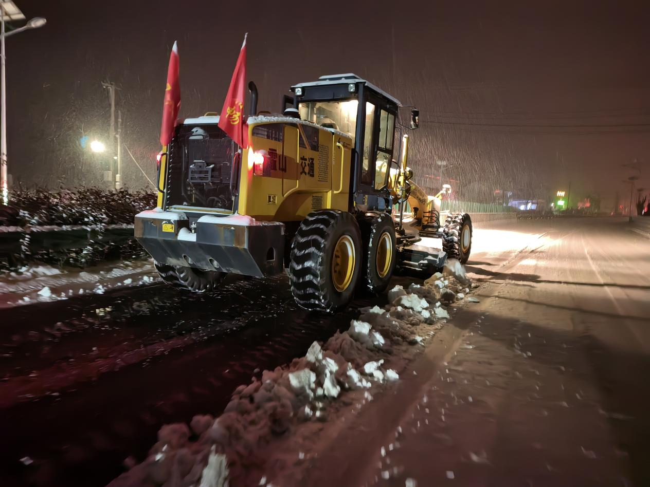 从深夜到清晨,橘红色的身影在风雪中穿梭,机械的轰鸣与铁锹的碰撞声交织。据统计,本轮应对中,霍山县交运局累计投入应急抢险人员180人次、铲雪除冰机械设备30余台,铲雪作业里程280余公里,全县道路通行正常。