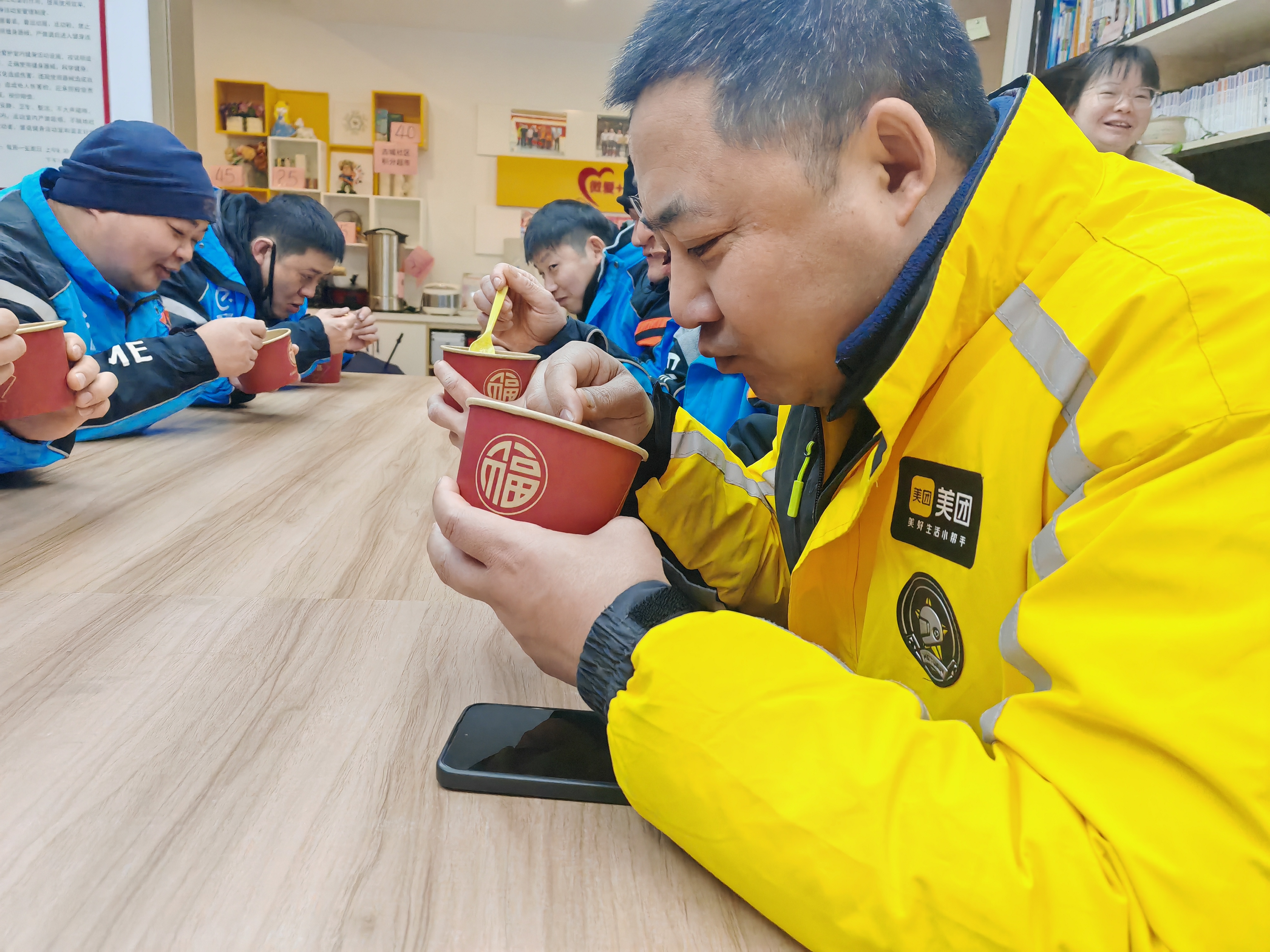 活动现场,社区志愿者早已提前熬制好一锅热气腾腾的八宝粥,红枣、桂圆、莲子等食材熬煮出醇厚香甜的滋味,氤氲的热气驱散了冬日的寒意。外卖小哥们卸下奔波的疲惫,围坐在一起,捧着温热的粥碗细细品尝,畅谈工作日常与新年期许。“平时跑单忙得顾不上吃饭,今天能在驿站喝到热乎的腊八粥,心里特别暖。”一位外卖小哥笑着说道,简单的话语道出了对这份关怀的珍视。
