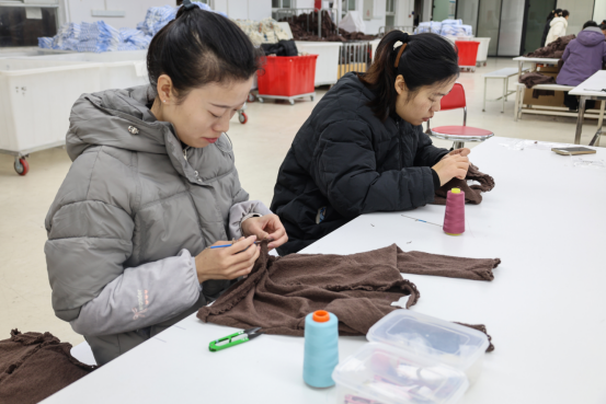 27岁的杨荣芝来公司工作已经五个多月了,“在这里上班近,又能照顾到小孩,还能挣钱,最重要的是我在工作中结识了很多朋友,性格也开朗不少,我很珍惜这份工作,会一直好好干。”杨荣芝的话语里,满是重拾自我的喜悦。这位年轻的“宝妈”边说边细致地检查刚制好的羊毛衫上有没有线头、浮毛、杂毛等情况。